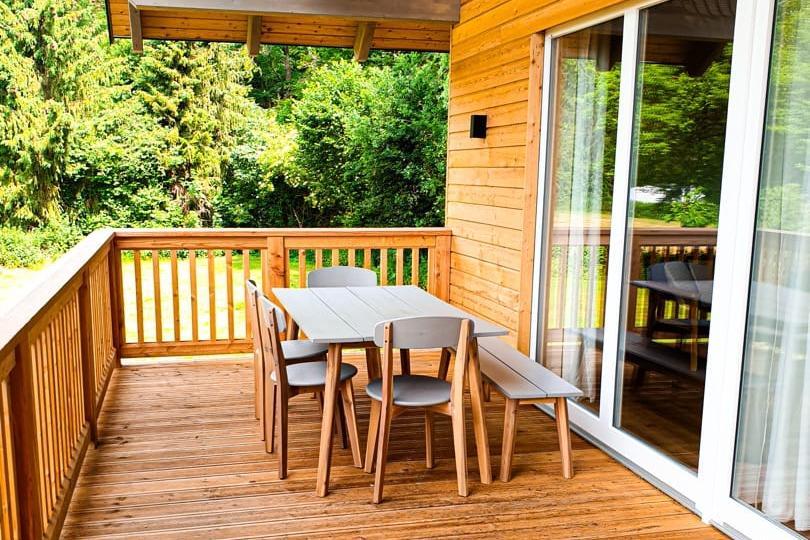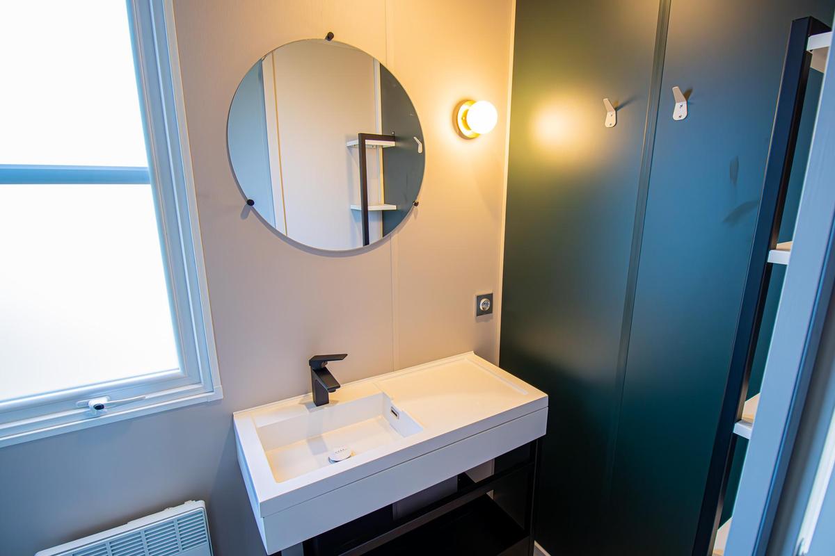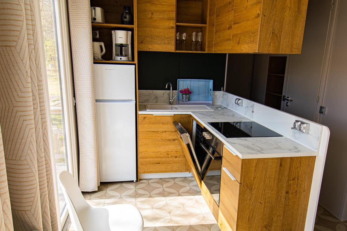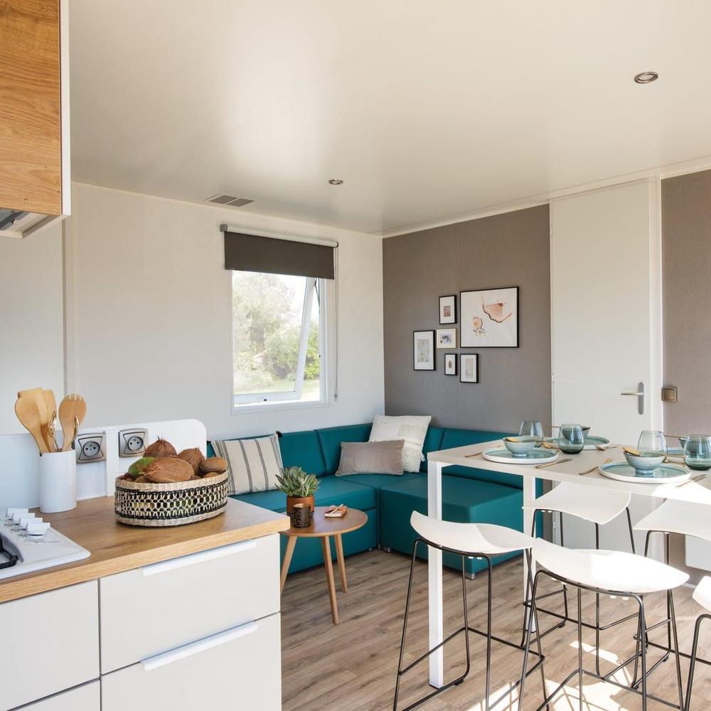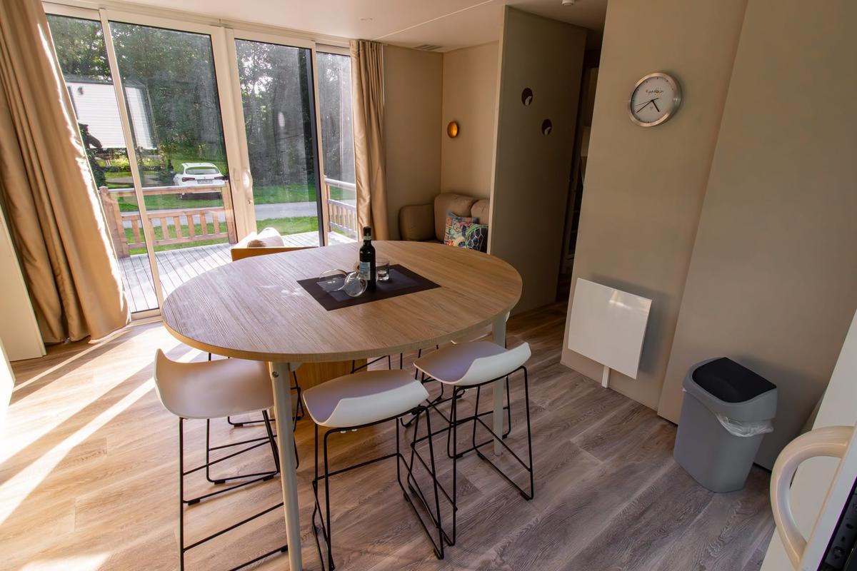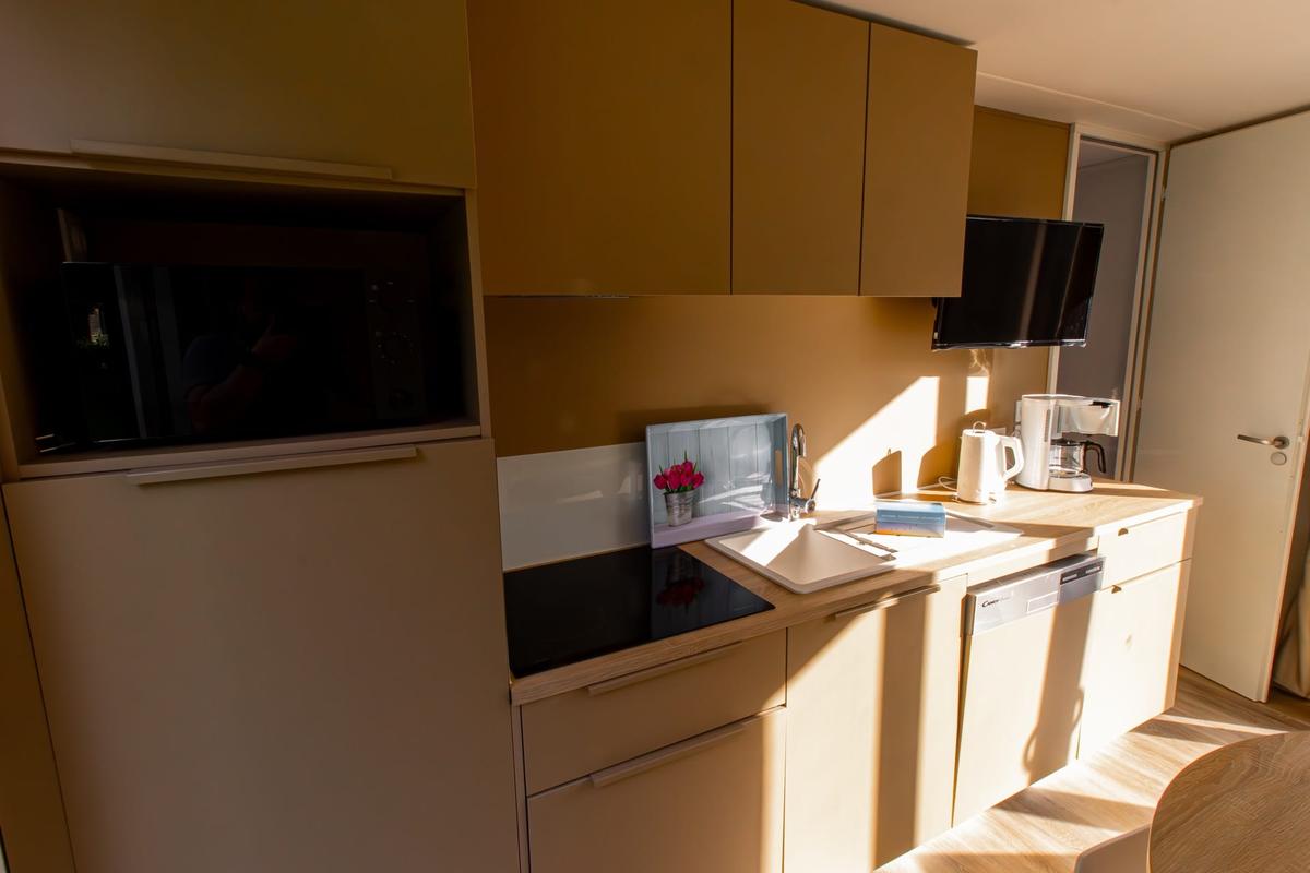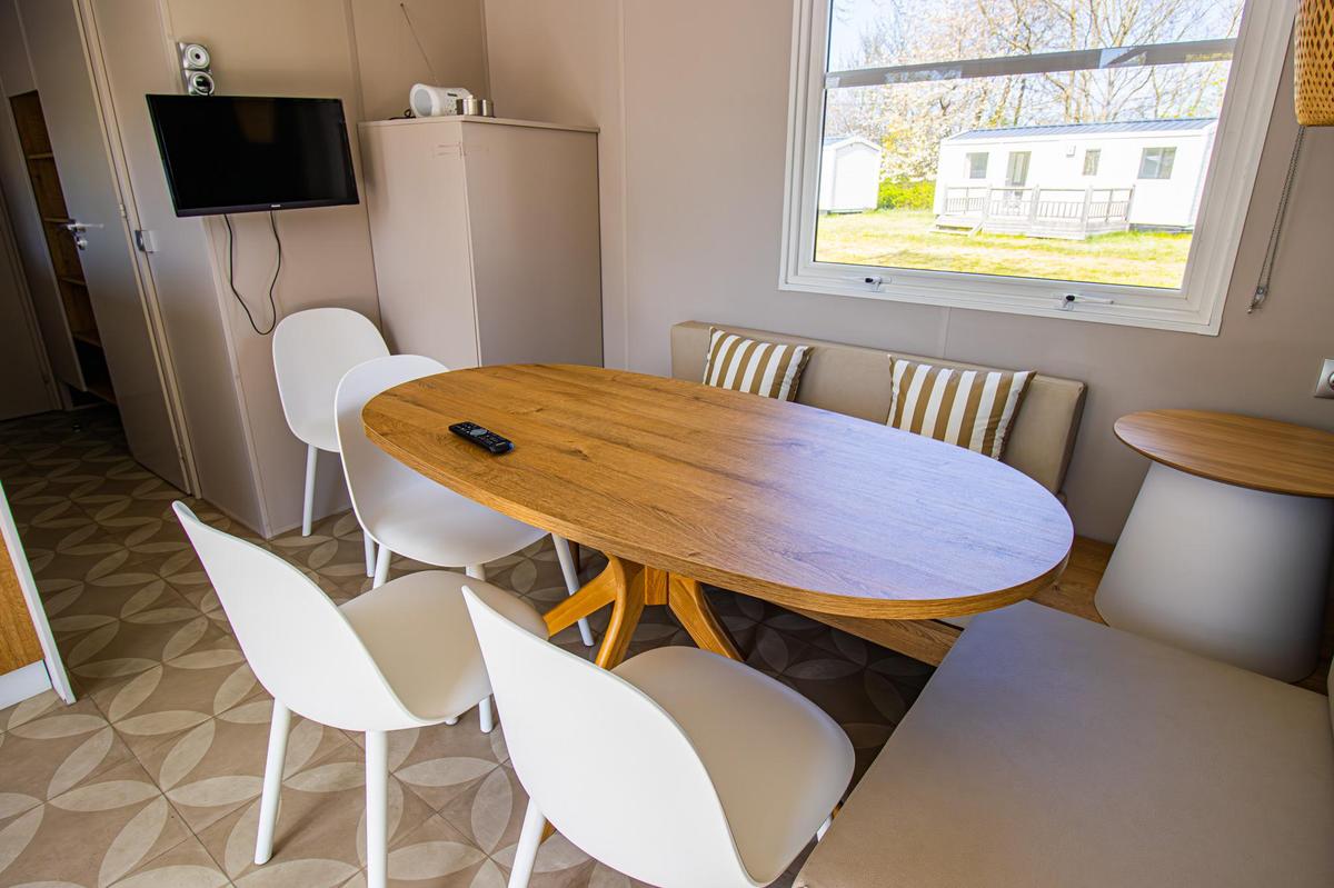 Schnuppern sie Campingluft, ohne auf Komfort zu verzichten. Ein Schlafzimmer mit Doppelbett, ein Kinderzimmer mit zwei Betten sowie ein weiteres Kinderzimmer mit Etagenbett – hier findet jeder ein passendes Plätzchen. Dazu gibt es ein Duschbad, ein extra WC und einen komfortablen Wohn- und Essbereich. Das Essen grillen Sie entweder auf der großen Terrasse oder Sie kochen in der voll ausgestatteten Küche mit Blick in die Natur. So schmeckt Urlaub gleich doppelt gut. Und weil Ihr Parkplatz direkt nebenan liegt, sind auch die Einkäufe schnell verladen.