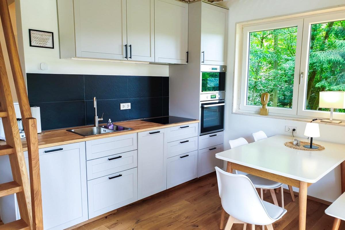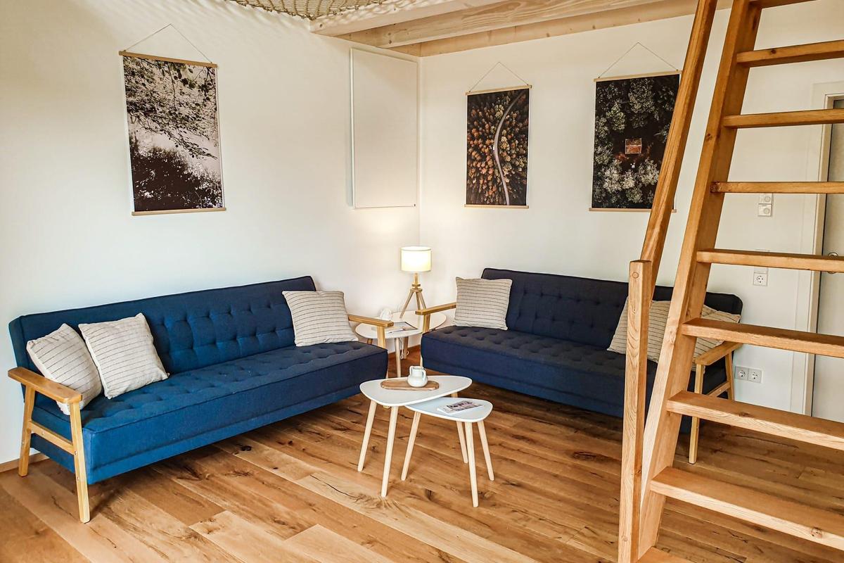 Jetzt geht’s hoch hinaus – in unserer Ferienlodge Baumhaus erholen Sie sich in luftigen 3 Metern Höhe. Auf 56 Quadratmetern finden Sie alles, was Sie für eine erholsame Auszeit vom Alltag brauchen: Vier Schlafplätze, ein Schlafsofa, eine komplett ausgestattete Küche mit Backofen, Geschirrspüler und Mikrowelle und natürlich ein eigenes Badezimmer mit Dusche und WC. Und die Natur? Gibt’s quasi gratis dazu. Viel näher werden Sie dem Urlaubshimmel kaum kommen können.